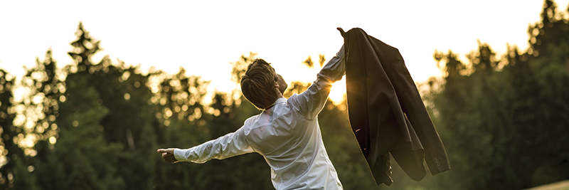 Young businessman holding his jacket with arms spread widely as he celebrates success and accomplishment standing outside in beautiful nature as the sun is setting.