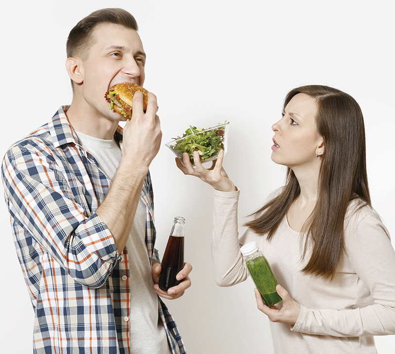 Couple man and woman standing with green detox smoothies, salad in glass bowl, burger, cola in glass bottle isolated on white background. Proper nutrition, healthy lifestyle, fast food choice concept