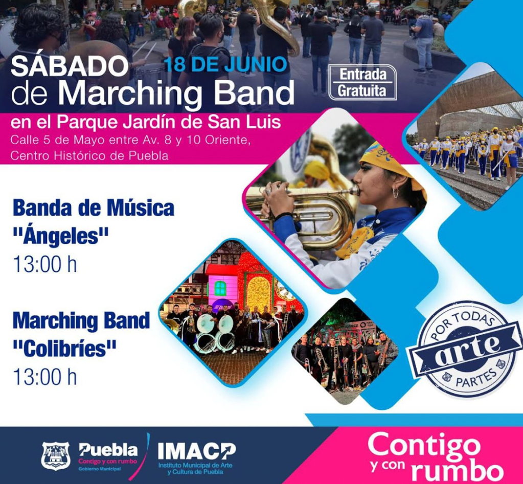 Es así como el Zócalo albergará la presentación del violinista de Ricardo Campos este sábado 18 de junio, a partir de las 14:00 horas, para luego cederle el espacio al saxofonista Emeterio Rivera. Tanto la Plazuela de San Luis y el Parque Centenario también serán zonas de expresión artística; a las 13:00 horas con la Marching Bands Ángeles de Puebla y Colibríes, y a las 14:30 horas con un club de lectura con libros Pop-up, respectivamente.