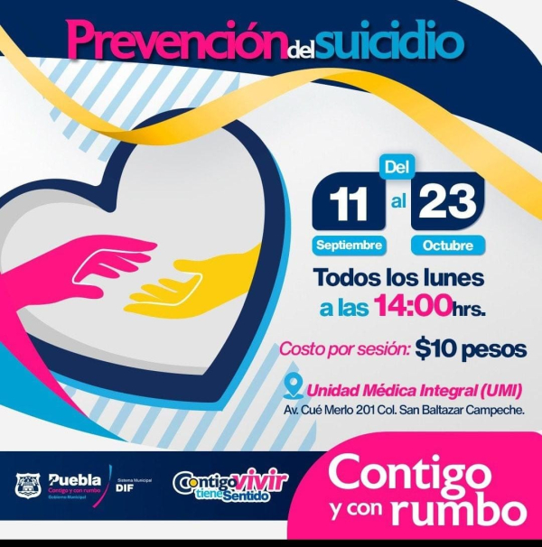 Liliana Ortiz Pérez, Presidenta honoraria del SMDIF, informa que durante septiembre y octubre todos los lunes a las 14:00 horas se puede tomar el Taller de Prevención del Suicidio, en la Unidad Médica Integral (UMI) –ubicada en la avenida Cue Merlo 201, San Baltazar Campeche-, dicho curso tiene como objetivo crear espacios seguros para las y los adolescentes que transitan por momentos difíciles, así como para su red de apoyo, en el aprenderán primeros auxilios psicológicos, factores de riesgo y protección, inteligencia y gestión emocional, validación de emociones, autoestima y asertividad.