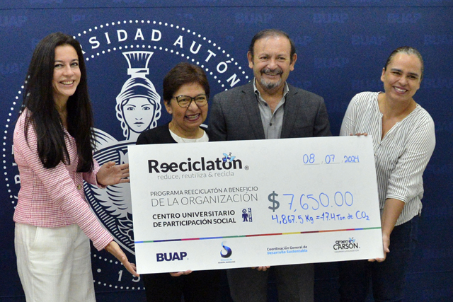 Al entregar este cheque, la Rectora Lilia Cedillo Ramírez agradeció a la Coordinación General de Desarrollo Sustentable de la BUAP la organización del Reciclatón 2024, una actividad que fomenta el aprovechamiento y manejo responsable de los residuos, lo que se suma a otros programas que maneja esta dependencia y que permiten a la institución ser reconocida como la segunda universidad más sustentable de México.